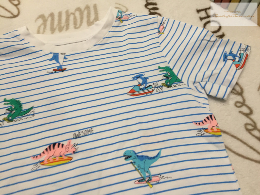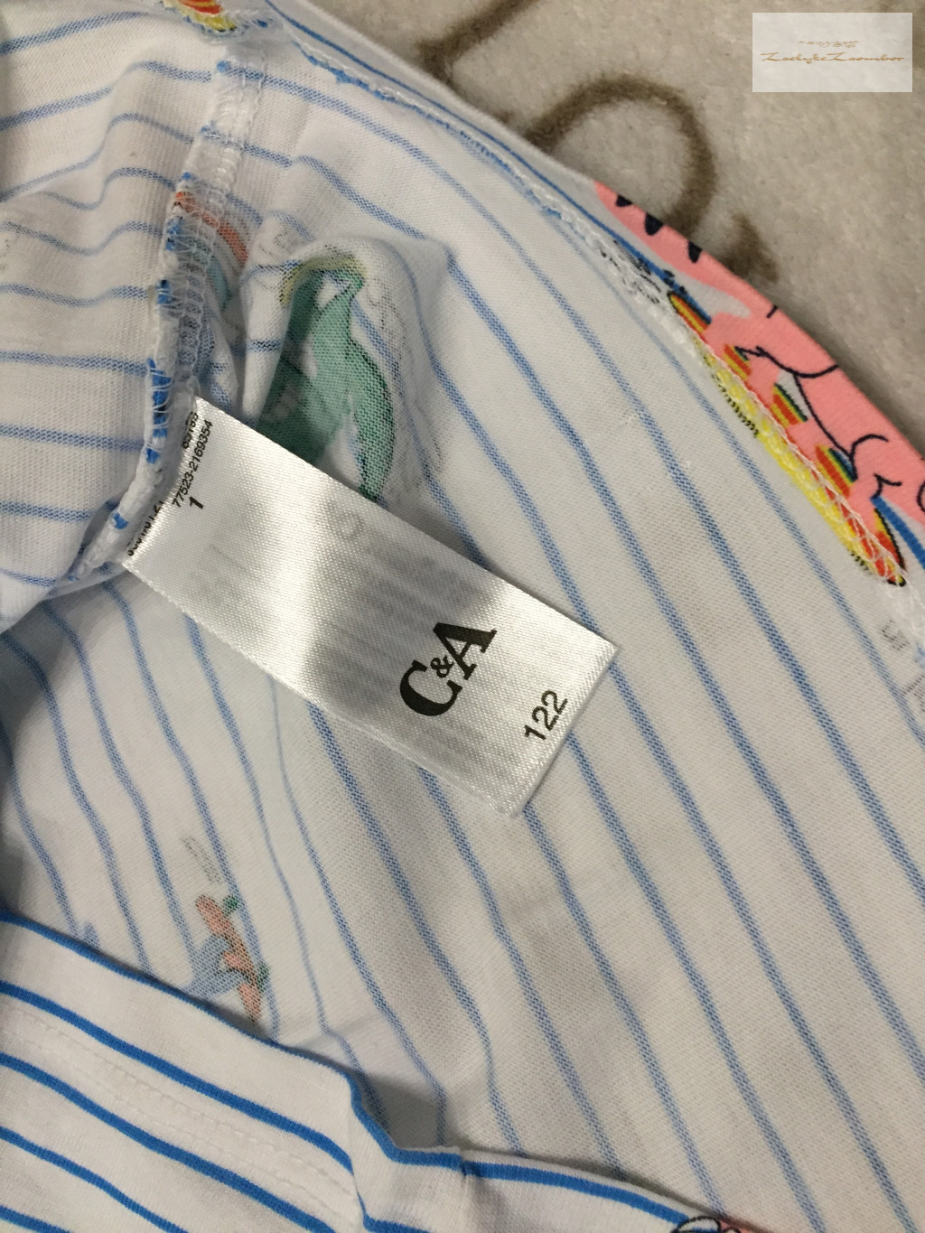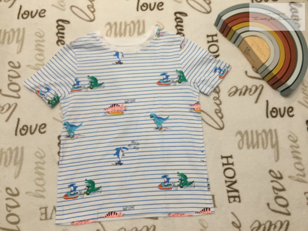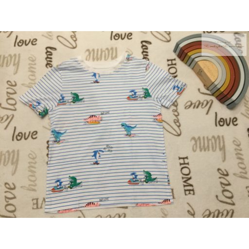 C§A 7 év 122 cm kék csíkos, színes dinó mintás vékony pamut fiú felső - új, csak lecímkézve - th 45 cm, v-v 29 cm