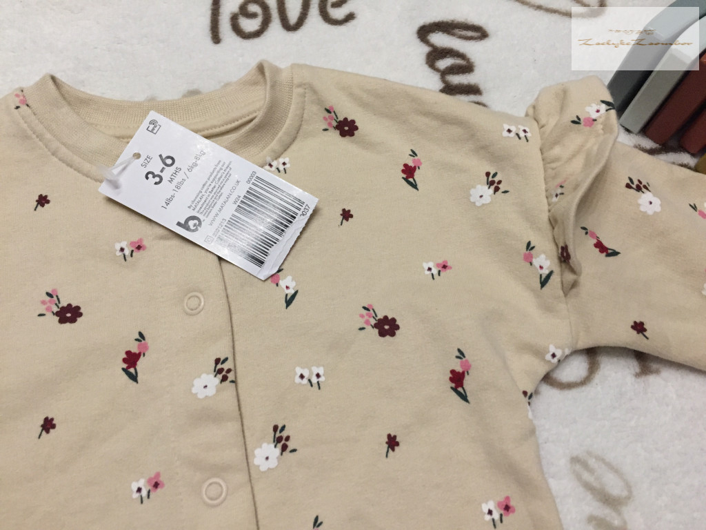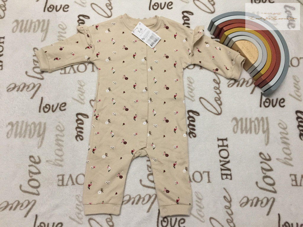 Matalan 3-6 hó 62-68 cm bézs, apró virágmintás bolyhos belsejű puha pamut lány rugdalózó/ kezeslábas--új, címkés