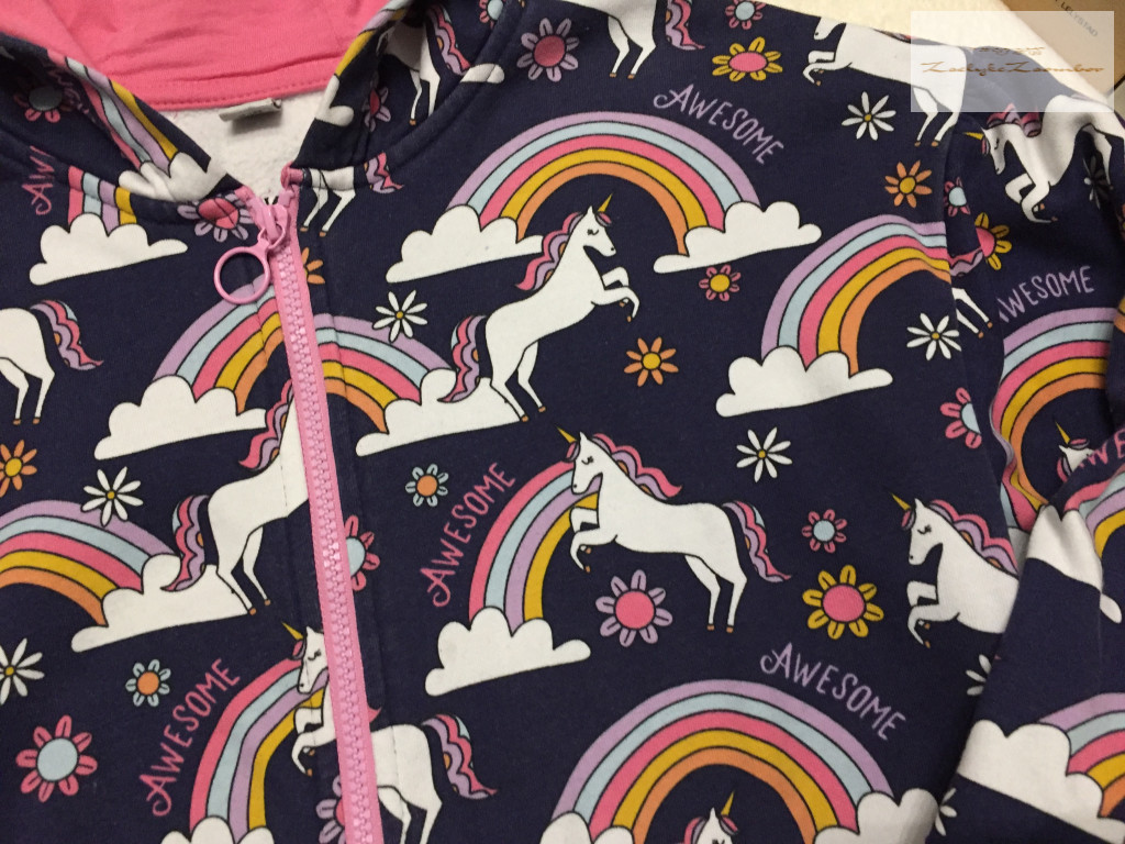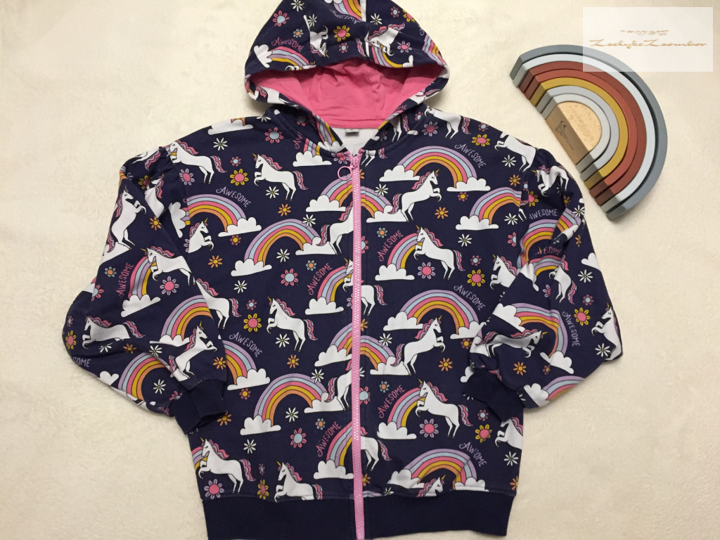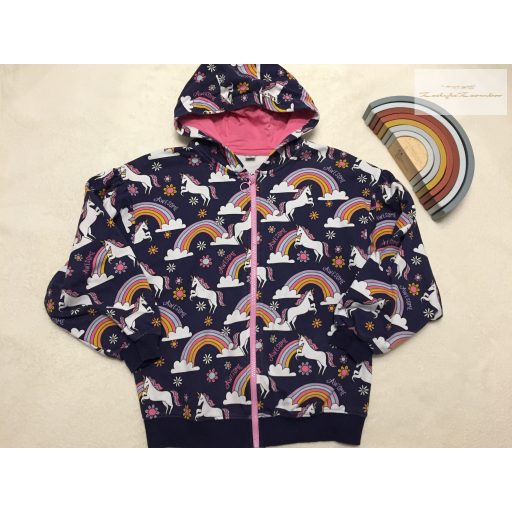TU 11 év 146 cm kék, színes unikornis-szivárvány mintás pamut lány felső/ pulóver - újszerű,hibátlan - th 60 cm, ujja 62 cm, mellnél 2 x 48 cm